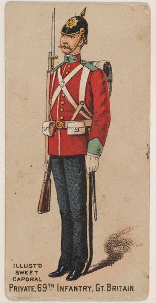 Kinney Brothers Tobacco Company created this small lithograph to promote Sweet Caporal Cigarettes, as part of the Military Series (N224). These cards capture a moment in time that reflects the intertwining of commerce, nationalism, and military authority. The officer pictured is idealized, embodying the power and prestige of the British Empire. Yet, the image is also an advertisement, commodifying military service for consumption. The British Empire's global reach was built on the labor and resources of colonized peoples, rarely acknowledged in these depictions. The red uniform and gleaming sword represent authority, and the cigarette becomes a symbol of leisure. These cards were collected and traded, embedding these images of power into everyday life. How does seeing this image now, removed from its original context, change its meaning for you?