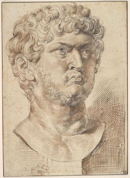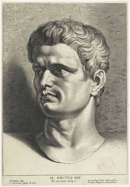 Curator: Oh, this gives me the shivers. The brooding intensity practically vibrates off the page. Editor: And it's a powerful vibration. This engraving, "Nero (after Rubens)," was completed in 1638 by Paulus Pontius, based on a Rubens drawing, and depicts Nero as an antique bust. The original may have been inspired by a now lost marble bust. Pontius perfectly renders the complexities of the man, or at least the image of him they wanted us to believe. Curator: It is theatrical, wouldn't you agree? Almost Shakespearean in its drama. You can almost hear the whispers of ambition and tyranny echoing from those sharply etched lines. It's like looking into a mirror of power, isn't it? Scary and beautiful. Editor: Absolutely. And this is a very purposeful rendering of power and representation. Notice the choice of medium: engraving. In replicating a Roman bust through printmaking, Pontius taps into the very core of what portraiture was during the Baroque period. Prints could circulate ideas about power widely, solidifying political messages throughout Europe. What Nero represents is secondary to *how* that representation operates. Curator: That’s a really fascinating point. It's like he’s being duplicated and unleashed on the world! It’s interesting that he did this rendering based on Rubens; it looks like an embrace of complexity. Pontius isn’t making Nero into some simplistic villain—the beauty is still there. Editor: The aesthetics definitely matter here. The crisp lines of the engraving serve to not only immortalize the bust, but to elevate it, and Nero along with it. This romantic ideal of a leader, even one as violent as Nero, perpetuated in visual culture is meant to awe and even inspire audiences of the time. We can learn a lot from this tension. Curator: It almost feels like a challenge—dare we be seduced? Even with knowledge of Nero’s...tendencies. Maybe it speaks to the way beauty, like power, can corrupt. A potent thought. Editor: I agree. And looking at the piece in this setting can also make us consider art's complicity in shaping power throughout history, too. Curator: Hmm. Something to consider, always. Editor: Indeed. Let’s move on.