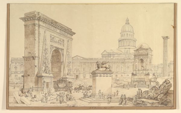 Curator: Let’s take a look at "An Architectural Capriccio; a View Through a Great Arch with an Obelisk in a Piazza in the Middle Distance," a piece created by Charles Michel Ange Challe between 1730 and 1778. Editor: The scale and depth are striking—almost dreamlike. There’s something very evocative about the interplay of light and shadow defining these monumental structures. Curator: Exactly. Challe employs colored pencil here, a choice which itself invites exploration. In the 18th century, drawings were preliminary tools, and to that point this “capriccio” presents an imagined, idealized space rather than a precise record. Consider the social role of the draftsman within the court. Editor: Yes, the materiality reflects a time of courtly patronage, but beyond the architectural representation, one recognizes the social power imbued within these monuments. I see themes of spectacle and control being presented. The figures below are dwarfed. Curator: Indeed, that contrast in scale subtly enforces an ideological message—power and permanence celebrated through grandiose construction and a corresponding labor. He's showcasing his technical prowess in perspective and architectural design while serving the aspirations of the ruling elite. Editor: Absolutely. How fascinating that an artistic rendering simultaneously represents status while influencing cultural attitudes. Even this choice to represent Baroque ideals instead of, say, Neoclassical ones, sends a subtle political message in the language of design. Curator: I agree. It speaks volumes about what values were deemed desirable and how this idealized vista, using print and drawing, acted as both record and aspiration. The lines feel loose and almost unconcerned with a perfect replica. Editor: It begs us to look critically at what that aspiration really entails—the narrative that grand architecture weaves, for those who commissioned it and those who labor in its shadow. It prompts me to think what are the deeper social forces shaping aesthetic choices of the time. Curator: It’s true; beyond a beautiful artifact, it shows the ways that art creation is inherently linked to power structures. Editor: Right, a window into the layered meanings behind even the seemingly simple choice of medium, in colored pencil, depicting towering architecture. It holds stories beyond the surface.