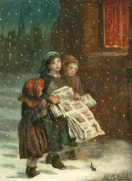 Curator: What strikes me most immediately is the palpable sense of cold and quiet. The entire palette seems subdued, almost muted by the snow itself. Editor: Precisely. We are viewing “Genre Scene," rendered in oil paint. Though undated, it clearly engages themes of both realism and romanticism characteristic of the period, likely depicting a winter landscape with figures in a poignant scene of everyday life. Curator: Look at the visual weight the artist places on the faces, particularly the child. The wetness around the eyes isn't just light playing across the cheek, but a visible sign of distress, made so vivid by its contrast against the coarse fabric of her clothing. The mood is unsettling. Editor: And consider that log building looming in the background and, the gate partially opened. Houses represent stability, protection, often cultural belonging. What could the implications be if we note that its threshold is not clearly welcoming, but obstructed in snow and the general grayness? What could it suggest about home or security in the socio-political context of the time? Curator: Interesting to frame the ‘domestic space’ so. But what about the emotional architecture? Even without precise dating, the image presents archetypal themes that resonate deeply. The very stoicism in the boy's posture speaks volumes about assumed responsibilities at such a young age. This isn't merely a representation of a genre, but the rendering of enduring emotions, especially childhood loss, framed in very particular class terms. Editor: I agree entirely. I mean, we must remember how "genre painting" rose to prominence—often glossing over, even normalizing certain harsh realities that reflect systemic inequalities in 19th-century Russian life. Consider the visual tropes of their attire. How might the depiction serve, even unwittingly, certain ideological aims of that period? Curator: An unsettling image with subtle clues pointing to an exploration of both outward, material states, and a rendering of internal emotional conditions in childhood, made possible through strong representational skill. Editor: Indeed. Art often holds up a mirror to society, reflecting not only what is, but also prompting questions about what could be. The socio-political questions certainly cast new light on these seemingly simple wintery narratives.