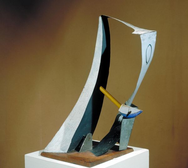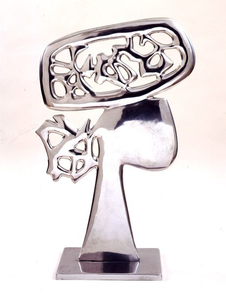 Curator: Immediately, I notice how "Semiha," realized in 1969 by Étienne Hajdu, uses a gleaming metal to create a fluid, biomorphic form. The play of light is mesmerizing, isn’t it? Editor: Absolutely, but the smoothness and reflectivity almost obscure its potential. The high polish draws your eye, but the sculpture strikes me as evoking broader, urgent narratives around labor and craft that can otherwise be overlooked. Curator: Tell me more. Editor: Considering it was created in '69, we have to ask—what commentary, conscious or unconscious, exists in these metal forms? How do the processes of molding, shaping, and polishing – likely carried out by specific, yet unseen, artisans – embed social and political histories? The material and its crafting aren't neutral. Curator: I see your point. Hajdu, with this piece, seems to negotiate that tension between material reality and aspirational ideals, reflecting how materials become central to Modernism’s claim of its own originality, challenging art history itself. I think the formal simplicity contributes to its power – reducing complex emotional forms into manageable materials for industrial, perhaps even feminist interpretations. Editor: Definitely, by using sleek metal he perhaps tries to reconcile this by stripping it down to a more primitive expression. It presents form almost as a pre-gender state, raw and waiting to be defined by labor, society, and context. "Semiha" speaks volumes if you listen for it, even decades later. Curator: The abstract form certainly lends itself to varied readings. Its scale allows it to almost embody the domestic setting but in that way could invite dialogues about what has been seen as purely "women's work" and invite more interrogation than pleasure, as you point out. It encourages that reading through sheer, undeniable presence. Editor: Ultimately, what endures is that a simple-seeming construction sparks complex conversation by making it apparent as pure material. Thank you.