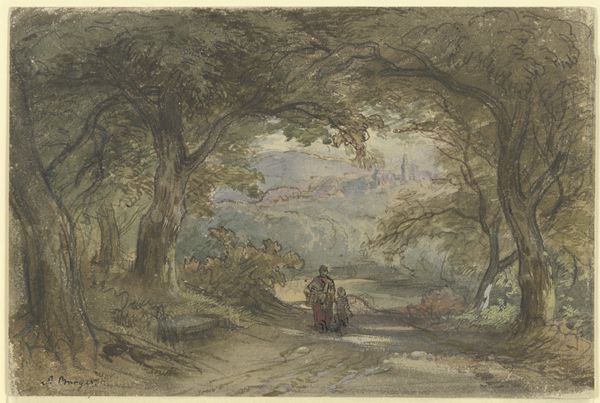 John Middleton created *A Country Lane* using watercolor on paper sometime before his death in 1856. The appeal of watercolor lies in its portability and its capacity for luminous effects. Middleton certainly exploits that quality here. Look closely, and you can see how the paper shines through the washes of pigment. Unlike oil paint, which allows for corrections and layering, watercolor demands a direct and confident approach. Middleton had to plan out his composition carefully, working from light to dark, and allowing each layer to dry before applying the next. The artist skillfully renders the textures of the foliage, the rough dirt track, and the cloudy sky. His work captures the ephemeral beauty of the natural world, using relatively modest materials. This artistic choice reflects a sensitivity to the inherent qualities of the medium and a desire to connect with the landscape in an immediate way. Ultimately, the material and process shape our understanding and appreciation of the artwork.