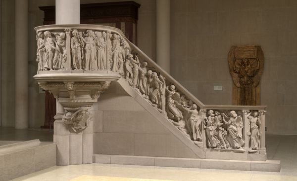 Editor: Here we have Hendrick Rusius' "Pediment," a marble relief sculpture from around 1654 or 1655. It has such a strong, almost regal presence. All that stone is just...imposing. I am wondering, what stands out to you about this piece? Curator: This "Pediment," it is true, carries itself with a grand air. What draws my eye are the fragmented narratives—these separate pieces that coalesce, hinting at stories deeply embedded in the cultural memory. Note the lions, for example. How do these regal symbols operate? What collective associations did they trigger for the original audience, and what traces of those associations persist today? Editor: That’s fascinating. So, the lions aren't *just* lions, they're symbolic representations of...power, maybe? Curator: Indeed. Power, courage, nobility. These animals act as visual shorthand, a language understood within a specific cultural framework. And the fragmented nature, almost archaeological, underscores how history is both revealed and obscured, demanding active interpretation. Consider the cityscape; what do you think its inclusion signifies? Editor: It's like they're deliberately presenting a history... but in pieces. The city almost feels secondary to the coat of arms and lions. Is the city being protected? Commemorated? Curator: Precisely! This piece invites speculation. The Rusius work isn't merely a decoration, but a container for cultural narratives. It seems to ask us what it truly means to represent not just physical space but also historical time through emblems. What will viewers in the future assume based on our civic and political monuments? Editor: I’ve never really thought about it that way. It’s amazing to think about what stories even these inanimate objects can hold, and the legacy they will leave.