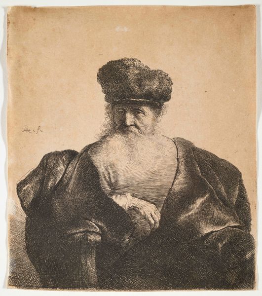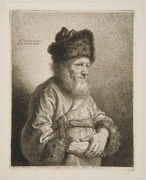 Editor: Here we have Antoine Marie Labouchere's "Portrait of an Unknown Old Man with a Fur Hat" from 1812, a drawing on paper. The cross-hatching gives it a soft, almost dreamy quality despite the man's stern expression. It feels very personal, perhaps due to the inscription at the bottom? How do you interpret this portrait? Curator: The inscription dedicating it to his wife infuses this image with significant personal meaning, layering private emotions into a public display. Consider the fur hat, though. What does that say to you? Editor: Warmth, certainly! Maybe status? Fur was valuable. Also maybe he’s Russian? I think that style hat is often associated with Russia. Curator: Precisely! Headwear carries weight – symbolic weight. Fur in 1812? It might signify a connection to the natural world or to particular social hierarchies. Labouchere subtly plays with cultural markers. It invites you to interpret his position, literally his 'stance', toward both nature and society. It also suggests an affiliation, perhaps aspirational, with specific geographical and cultural identities. Do you notice other culturally weighted aspects to the drawing? Editor: The way he clasps his hands. Is he cold, or contemplative, or… is it another symbolic gesture? It feels guarded. Curator: The hands offer intimacy and reserve. As for "cold", look closer... perhaps we are meant to consider "old". See the inscription along with these combined details? A complex statement. Editor: So the symbolism here creates a portrait layered with personal, cultural, and even emotional meanings! I’ll definitely think about those layers next time. Curator: Indeed. Looking closely unveils silent narratives within visual form, and continuity with portraiture traditions throughout history.