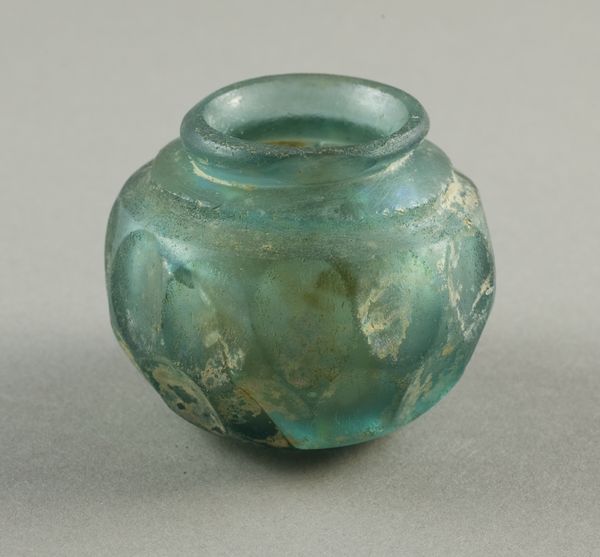 Editor: Standing here with this Ancient Levantine Jar from around the 4th or 5th century, I’m really struck by how delicate it appears, almost ethereal, even though it's made of glass and ceramic. It gives the sense of fragility surviving through centuries. How do you interpret the object’s surviving elements in this work? Curator: That fragility you observe speaks volumes. Consider the imagery etched and applied onto its surface: a repeating motif which, when first created, represented water or growth. Yet, after so much time, these decorations speak less about a literal representation of growth and more towards an evocative reminder that nothing is permanent. Do you see the traces of iridescent weathering? Editor: Yes, definitely, it's beautiful. The shimmer almost looks like it's glowing with a light from within. Curator: Exactly. The iridescence, caused by chemical changes to the glass over time, creates a palimpsest. What once held precious materials becomes the most precious thing through aging. Its meaning is amplified when contrasted with its likely mundane original use. Perhaps storing oil or wine. Editor: So, the function informs how we feel when we see the jar now, understanding its journey through time and use? Curator: Precisely. The transformation of a utilitarian object into an object of contemplation tells us about both past cultures and our own impulse to preserve and imbue meaning. And we are transformed when reflecting about it. Editor: I never would have considered those details without your guidance. It makes you think about what ordinary items of our own time may one day mean. Curator: Indeed, the life of this simple jar transcends time to speak profoundly about history, loss, and transience, leaving a subtle yet poignant meditation on the passage of time.