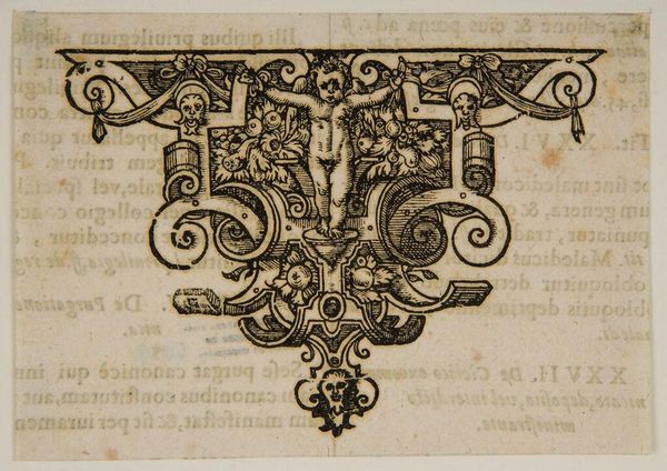 Curator: This striking head-piece, of unknown date and artist, presents such an intriguing set of questions about its role in the visual culture of its time. Editor: It gives me a feeling of ornate heaviness. The density of the black ink and swirling shapes are overwhelming and darkly beautiful. Curator: I think we can consider the imagery—the grotesque faces, the stylized foliage—as reflecting contemporary anxieties about power, gender, and the human form. How might this ornament participate in debates about social order? Editor: And what about the material? The texture suggests a woodcut or engraving, a medium of mass production. Was this design intended for elite consumption or wider circulation? Did the labor involved affect the value placed on this image? Curator: Precisely. These objects were rarely neutral. The head-piece acted as a marker of authority, or even resistance, depending on the context in which it was used. Editor: Seeing how materials and social forces intertwine opens up ways of understanding art’s impact. Curator: Absolutely, by viewing such objects as cultural tools, we begin to understand art history as a site of dialogue.