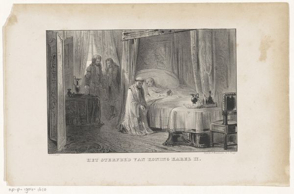 Curator: The tonal gradations in this 1773 engraving, "Penelope wordt gewekt door Euryclea" by Thomas Burke, are incredibly subtle. Note the soft rendering of the figures. Editor: It has a sort of melancholy grandeur, doesn’t it? The smoky grayscale palette feels almost dreamlike, appropriate considering the scene. There's a stark contrast between the crisp lines defining Penelope and the almost vaporous shadows in the background. Curator: Burke chose to represent a pivotal moment from The Odyssey. We see Penelope, Odysseus's wife, still asleep and seemingly in despair. She is being awakened by her loyal nurse, Euryclea, who is bringing news of Odysseus's return. The other female figure is another servant. The image carries a lot of the emotional weight around long waiting and anticipation. Editor: Symbolically, the dark tonality likely carries associations with Penelope’s prolonged grief and loneliness. That contrasts sharply with the single, flickering flame on the right; it provides both visual light and, perhaps, hope. Its placement—isolated and yet powerful—serves as a beautiful compositional counterpoint to Penelope’s figure. Curator: Precisely! Light in such images always conveys the presence of hope or divine knowledge breaking into darkness, signifying that moment when inner grief and anticipation transitions to reality. The scene emphasizes not just Odysseus’s physical return but also the psychological journey toward the re-establishment of order and justice. Remember, the image distills cultural memories—both heroic and domestic. It captures something timeless in human relationships, particularly of faithful devotion, with a heavy and layered story. Editor: Yes, the overall impression is powerfully balanced—dark and light, despair and hope, quiescence and action—captured expertly by Burke's compositional choices and mastery of engraved line. And while heavy in historical implications, Burke manages to produce a deeply personal glimpse into one intimate moment. Curator: The image as an artifact underscores not only how ancient narratives continually resonate in visual form but also speaks to the enduring power of those stories to define cultural norms. Editor: Ultimately, I am most impressed with how a classical scene is so convincingly rendered, its emotional timbre carried by skillful use of monochromatic tone.
