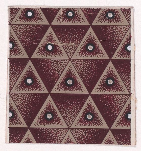 Curator: Here we have a fascinating textile design from around 1840, created by an anonymous artist. It's titled "Textile Design with a Network of Circles with Pearls in the Middle," and it uses drawing and print techniques to create a unique visual experience. Editor: My initial reaction is that this design is unsettlingly mesmerizing. The way the circles pulsate outwards reminds me of looking into the abyss. What’s particularly striking is the stark contrast between the delicate background and the somewhat aggressive maroon or dark red spheres. Curator: The pattern is intriguing. The repetition, while aesthetically pleasing, might represent the cyclical nature of social structures or the confinement of individuals within a system. Think about the constraints placed upon women in textile production during that period, for instance. Did the anonymous artist seek liberation in the very act of its creation? Editor: It's impossible to overlook how the central 'pearls' seem to act as focal points. It calls forth connotations of surveillance and watchfulness that span throughout history in religious, state, and medical realms, among many others. I mean, who is doing the looking here? Curator: That's a potent observation. The "pearls," enclosed within these dark circles, almost appear trapped. And that raises the critical question of value, then: whose gaze and which contexts grant these objects—or people—worth? Considering the historical context of mass production and labor division, is there commentary on exploitation here? Editor: Certainly. Those 'pearls' do bring ideas of value and rarity. It is difficult to miss their visual impact, and considering their color--which isn't a true 'pearl' color—perhaps challenges our expectations of worth altogether. This textile might play into societal and political critique. Curator: It definitely compels us to delve into socio-economic implications of ornamentation and consumption. Patterns themselves, often deemed feminine or trivial, mask intricate dialogues concerning class and control. Editor: In this sense, it feels remarkably relevant. While aesthetically anchored in the 19th century, these design principles hold up in the modern era when surveillance and representation are questioned. Curator: Yes, there is something enduring about the way pattern, when charged with meaning, can reflect, distort, and ultimately, help us re-imagine systems of power. Editor: A very important contribution in seeing pattern not just as decoration, but an expression.