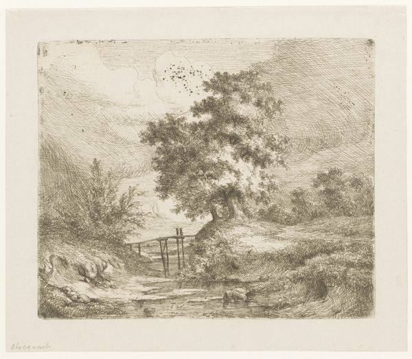 Editor: We're looking at "Boothuis op de oever" (Boathouse on the Shore), an etching by Arnoud Schaepkens, created sometime between 1855 and 1904. It's a small, intimate scene rendered in incredible detail. What really strikes me is the quiet stillness of the whole image. What do you see in this piece? Curator: This piece vibrates with symbolic weight, doesn't it? The boathouse itself can be viewed as a threshold. Do you notice how it straddles the line between land and water, nature and structure? Editor: Yes, it's like a transition point. Curator: Exactly! In the Romantic era, which heavily influences the style here, nature was often seen as a place of solace, of escape from the burgeoning industrial world. The boathouse, situated between worlds, holds the promise of both the familiar and the unknown. Also, the lone figure near the boathouse appears contemplative, don't you think? Perhaps symbolizing a human connection to the natural landscape. Does the texture from the etching technique add to this narrative? Editor: It definitely adds to the overall mood. The cross-hatching creates a soft, almost dreamlike quality, contrasting nature and domesticity. Almost nostalgic? Curator: Nostalgia for an ideal world? This imagery of the threshold, the lone figure, they echo timeless themes of human existence and cultural continuity, of finding our place within the world. The symbols have morphed but the essence resonates across time. Editor: I hadn't considered the boathouse as a threshold before. Curator: Consider the continuity, the underlying structure, always adapting to the changes in surface and time. Editor: Looking at it now, it is pretty amazing how many layers of meaning an artist can pack into such a simple scene. Thank you for your insights.