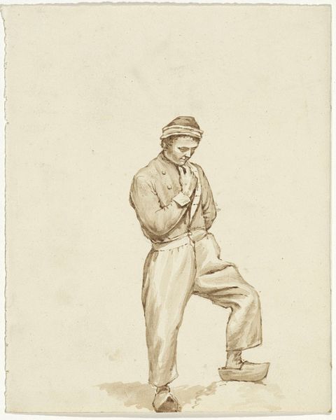 Curator: Let's spend some time discussing Ernst Meyer's "En romersk opvarter," or "A Roman Waiter," which dates from between 1797 and 1861, presently housed at the SMK, the National Gallery of Denmark. Editor: My first impression is of quiet dignity amidst humble circumstances. The limited palette and precise linework evoke a sense of somber restraint, doesn't it? It's so muted, almost like a fading photograph. Curator: Absolutely. This work fits neatly within the Neoclassical movement, where we see a renewed interest in the classical world and a focus on order, clarity, and rational thought. These artistic principles mirror larger societal shifts occurring, like rising class awareness and calls for political reform in many European nations. The genre painting style also brought a fresh interest to everyday life. Editor: Thinking about that renewed interest, this server embodies both the personal labor and larger systematic servitude. Considering its time period, who exactly *is* depicted here, and who had access to being portrayed in artworks like this? Does his pose hint at subjugation, or perhaps at pride in labor? Is there an intention behind depicting this individual rather than somebody of power or notoriety? Curator: Meyer's choice of subject could be interpreted as a subtle commentary on social structures of the time. It raises interesting questions about the dignity of labor and representation in art, doesn’t it? Editor: And even today, the artwork calls us to question labor exploitation. The engraving medium itself has significance too – cheaper reproduction helped the piece reach wider audiences, enabling discourse about labor standards. It gives the working classes access to engage in conversation surrounding class themes, such as inequity and exploitation. Curator: An astute observation! "A Roman Waiter" serves as more than just a snapshot of a man at work. Meyer uses it as a powerful vehicle for exploring the socio-political landscape of the era. Editor: Yes, and through that lens, we can use this piece of art as a starting point for exploring themes relevant to modern audiences, allowing for intersectional perspectives that consider the legacy of labor rights, societal imbalances, and exploitation within current society. I keep thinking about today's gig economy and precarious labor contracts. Curator: Considering all our new insights, I find myself rethinking my perspective of what this simple work conveys. Editor: Precisely. It highlights that we still have much to unpack when examining power dynamics and their continuing effects today.