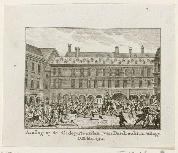 This print, made by Carel Frederik Bendorp in 1786, captures a moment of political turmoil in the Netherlands. It's made with etching, a printmaking technique that involves using acid to bite lines into a metal plate, which is then inked and printed. The fineness of the etched lines allows for incredible detail, evident in the depiction of the Binnenhof, or Inner Court in the Hague. This technique, while requiring skill and precision, was more easily reproducible than other forms of art. This speaks to the broader social context: the print medium allowed for wider circulation of images and ideas, even those depicting civil unrest. Note the tension between the detailed rendering of the architecture, likely intended to convey authority, and the chaotic figures in the foreground. The print becomes a potent record of a society grappling with change, capturing a fleeting moment of disruption in a format designed for dissemination. This work reminds us that even seemingly straightforward artistic choices can carry significant social and political weight.