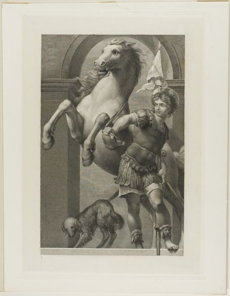 Joannis Jacobus Bijlaert created this artwork titled 'Alexander en Lysimachus' using pen and gray ink and brush and gray wash. It depicts Alexander the Great placing a crown on the head of Lysimachus. Created in the late 18th century, this drawing reflects the era's fascination with classical antiquity and its heroes. Bijlaert positions Alexander as a figure of magnanimity, rewarding bravery and loyalty. We might consider the relationship between the two men in the context of power, hierarchy and devotion. Lysimachus kneels, accepting the crown, a gesture which underscores their dynamic. What does it mean to depict an act of giving, especially within a context defined by military might and conquest? The ruins in the background suggest a civilization built on such power. Bijlaert’s portrayal invites us to contemplate not only the acts of historical figures, but also the symbolic weight of leadership, allegiance, and the legacies of historical power structures.