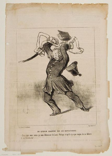 Curator: What strikes you first about Daumier's lithograph, "Un citoyen exaspéré par les buffleteries," dating from the 19th century? Editor: The dynamism. The figure’s wild gesture, all furious angles and exaggerated motion. The strong contrasts in tone further heighten the sense of drama and disorder. Curator: Absolutely. Daumier created this work during a period of intense political and social upheaval in France. As a print, it could be widely circulated, serving as pointed social commentary against the bourgeoisie's perceived indifference to the struggles of ordinary citizens. Editor: It's intriguing how Daumier uses line work. The frantic, almost scribbled quality gives the image a raw, immediate feeling, as if capturing a fleeting moment of explosive emotion. Note how his technique draws attention to the bulging eyes, wild hair and collapsing suit. Curator: The caricature is central. He was commenting on social and political life through art, challenging authority figures and questioning the status quo. "Buffleteries," which roughly translates to "nonsense," is key. The citizen is enraged that even after Louis-Philippe's reign ended, he is still dealing with petty annoyances. Editor: The way Daumier distorts the figure, stretching and exaggerating certain features while minimizing others, also heightens the emotional intensity. Look at the curve of the sword against the agitated sprawl of limbs; such an energetic composition! Curator: Prints like these were critical to shaping public opinion at the time. Daumier expertly used satire to engage the public, offering a critical lens through which to view their leaders and society. He highlights their self-absorption as he reflects back an attitude to his contemporary audience. Editor: It's impressive how Daumier achieves such power with a relatively simple medium like lithography. The restricted palette forces you to focus on the raw emotion and message being conveyed. This print certainly possesses a vital immediacy. Curator: I find it to be such a compelling commentary on the lasting effects of societal change, as even revolutions often leave mundane frustrations behind. Editor: Indeed, the artist's grasp of visual rhetoric really brings to life the angst and chaos he seeks to depict.