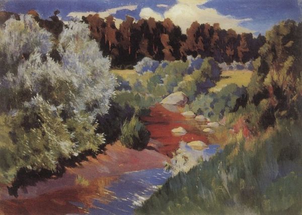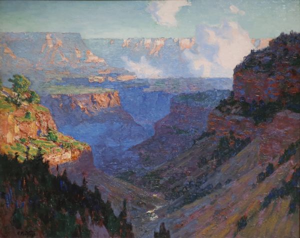 Curator: We’re looking at "Bluffs on the Guadalupe River, 17 Miles above Kerrville, Texas," a 1921 oil painting by Robert Julian Onderdonk. Editor: The dark blues of that foreground rock face immediately grab my attention. There's a real weight and roughness to the texture, making the light in the distance almost glow by comparison. Curator: Absolutely, Onderdonk's application of plein-air painting here contributes to its charm. It's a time capsule from when he was actively mythologizing the Texas landscape. Editor: Plein-air! Which suggests this wasn't a sanitized, studio vision, but a direct engagement with the location's elements. It’s all about the materiality of place then. Was Onderdonk conscious about accessible production and display here or was this only accessible for the elite? Curator: Onderdonk intended his art for broader civic engagement. He aimed to depict a distinctly Texan aesthetic—beauty tied to the land itself, meant for public consumption, a sort of democratization of landscape. However, in his time period that concept itself would’ve had limitations. Editor: Interesting tension! The light and accessible subject matter created through the intensive labor of plein-air is at odds with the limited accessibility. That play of light across the trees also hides his physical labor – that rough, direct materiality contrasts against the smooth and polished look. Curator: Indeed, the vibrant colors almost seem designed to evoke a sense of optimism. He made it during an era marked by industrial transformation in Texas and other social changes, it feels intentional, this harking back to a landscape ideal. Editor: And that accessibility also masks class assumptions—who gets to define "beauty," and who benefits from idealizing it? What equipment, whose land are you engaging with? So, while Onderdonk seems invested in depicting the common landscape, his position and the context of the era complicate that idea. Curator: The Texas landscape holds a certain social weight. But beyond the social history and civic intent, his commitment to landscape allowed the rise of many great regionalist painters and teachers, so he left quite an institutional legacy! Editor: So much to unpack in one small vista! It pushes you to engage with questions of labor, location, and social consumption. Curator: Precisely, Onderdonk gives us this moment of natural beauty filtered through artistic creation and also, socio-historical nuance.