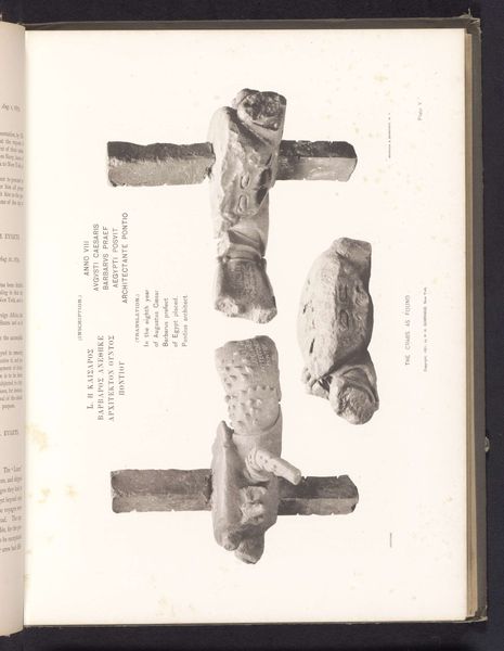 Curator: What immediately strikes you about this piece, its composition perhaps? Editor: We're looking at a print from 1881, depicting an antique model of the Temple of On, or Heliopolis. It looks like a relief. I am struck by how the geometric forms interplay to create something that is both representative and abstract. What elements stand out to you? Curator: Consider the print's rendering of the Temple model: The precise lines, the careful articulation of each plane, these formal choices reveal a commitment to clarity and order. It invites contemplation of structure, would you agree? How do the shadows shape the different forms? Editor: Absolutely, the strong shadows emphasize the depth and complexity of the structure, although the damage to the artifact introduces disorder into the system, creating contrast. Curator: Indeed, even in its fragmented state, the architectural form adheres to underlying geometric principles. The relationships between the various components — the base, the columns, the relief carvings— all seem deliberately calibrated. Observe how your eye traces from bottom to top of the print; do the various models contribute to this feeling? Editor: Yes, they do. Presenting multiple angles is really helpful. I hadn't considered how carefully balanced it all feels despite the age and evident wear. I initially saw it as ruined, but now I notice a different perspective and visual intent. Curator: Precisely! We move beyond ruin to appreciation for the structural intent and balance inherent in the model’s design, immortalized through precise, formal representation. Editor: Thanks so much, I’m taking new insights from ancient ruins, to better understanding their visual story!