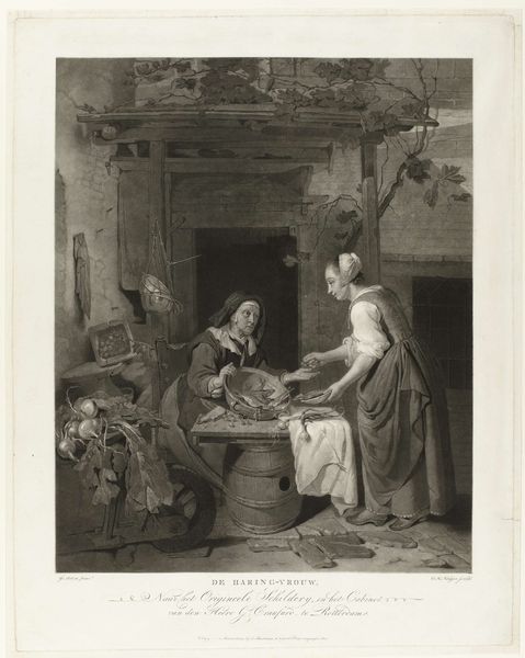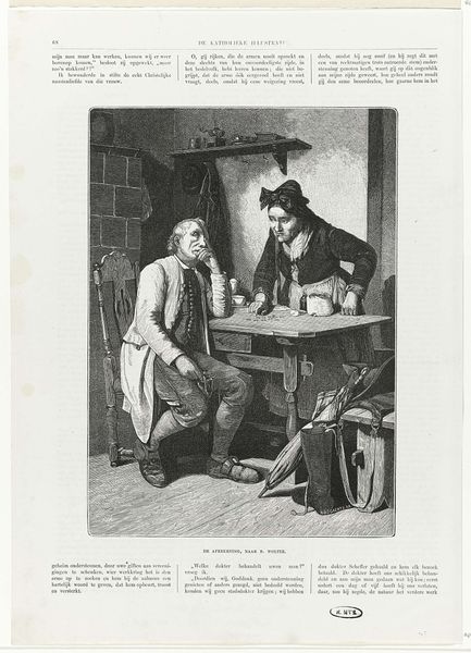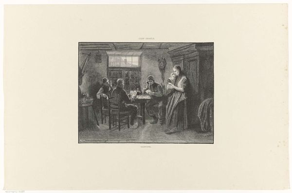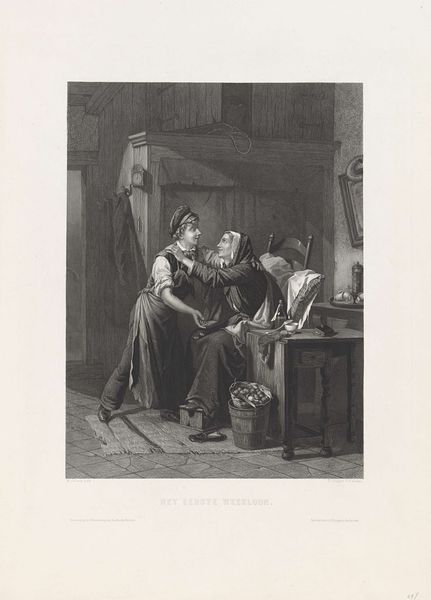 Dirk Jurriaan Sluyter created this artwork, "Vrouw omarmt jongeman," a 176 by 114 mm print. Immediately, we see a stark contrast in values, a full range from light to dark. The artist has placed the figures centrally within a box-like room defined by strong horizontal lines. The embrace, rendered with detailed cross-hatching, is the focal point. Here, Sluyter plays with the dialectic of touch—the woman’s hands on the young man’s face suggest both affection and perhaps a subtle assertion of control. The formal composition invites us to consider binary oppositions, such as youth versus age and male versus female, challenging the established meanings of traditional family roles. Notice how the lines of the room converge, drawing the eye toward the figures. The artist destabilizes conventional notions of domestic tranquility. The very act of embracing, framed by the stark geometric forms, is not merely sentimental but serves as a visual metaphor. Through his manipulation of form and perspective, Sluyter invites ongoing interpretation and re-evaluation of familiar themes.
