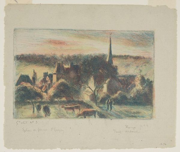 Camille Pissarro made this etching, titled *Church and Farm at Éragny*, using a metal plate and etching needles. Pissarro scratched lines into a coated metal plate, which was then submerged in acid. The acid bit into the metal where it was exposed, creating grooves that would hold ink. This plate was then used to print the image onto paper. The result is a landscape of remarkable tonal variation, achieved through the density of the etched lines. See how some areas, like the trees, have a depth of shadow? That's from the concentration of etched marks, each one carefully made. The etching process allows for the creation of multiple identical images, which democratized artmaking. Pissarro, who was deeply engaged in left-wing politics, was interested in how art could be more widely accessible, and less of a rarified commodity. The print medium itself speaks to the rise of industrial production and consumption, even as the image depicts a rural scene. It’s a potent reminder that even seemingly idyllic landscapes are shaped by the forces of labor, technology, and the wider world.