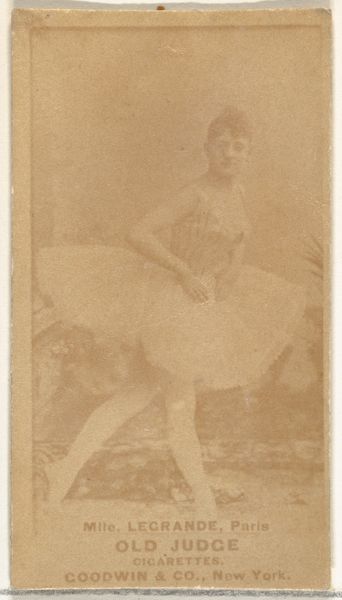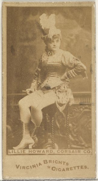 Curator: This sepia-toned photograph, dating from the late 1880s to early 1890s, is from a series titled "Actors and Actresses" by Allen & Ginter, specifically "Kate Uart, Corsair Co." It was created as a promotional card for Virginia Brights Cigarettes. Editor: She strikes a powerful pose, doesn’t she? Very self-assured, almost challenging the viewer. It’s striking how such a small image can convey such presence. Curator: The world of theatre intersected with an expanding commercial market in interesting ways in this era. Consider this: this tiny card offered a fleeting glimpse into the glamorous world of the stage for a mass audience. It reflects both the rise of celebrity culture and the marketing tactics of the time. Editor: Absolutely. It also brings to mind the performativity of gender roles and identity, particularly for women at that time. She's playing a 'corsair,' a pirate, which allows for a certain transgression of expected female behavior. I wonder to what extent the character allowed her a space to move freely and to wield her own agency within patriarchal restraints. Curator: That's an interesting way to frame it. The popularity of actresses in advertising highlights how their images were circulated and consumed, really putting their private personas on display in conjunction with public performance in theatres, constructing powerful messages, albeit ones tightly controlled by industry forces. The card becomes a sort of democratized portrait, available to anyone purchasing cigarettes, a far cry from the elite painted portraiture of the past. Editor: But to circle back to your comment about control, look how confined her waistline seems. The restrictive corset she wears visually underscores the physical limitations placed on women then—even one seemingly as liberated as an actress playing a pirate, no? I feel there is an intriguing interplay between independence and containment visually embodied. Curator: Well, by looking at this image in its historical and cultural moment, the photograph serves as a compelling artifact reflecting social and economic forces. It certainly seems we’ve both viewed it under different, equally compelling lenses. Editor: Indeed, considering the cigarette card within the broad context of the late 19th-century gender politics adds nuance. It shows that seemingly simple commercial art holds many layers.