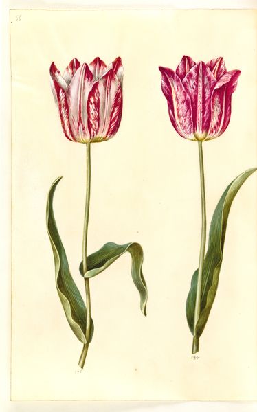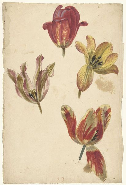 Sientje Mesdag-van Houten painted these two red tulips in watercolor. Although undated, we can see that Mesdag-van Houten worked within a generation of female artists in the Netherlands for whom flower painting was both a respectable genre and an opportunity to explore new approaches to the medium. The scale and composition of the painting are intimate and informal; rather than a carefully arranged bouquet, Mesdag-van Houten gives us a close-up of two flowers, observed with an unromantic directness. The swift brushstrokes, and the wet-on-wet technique, show the influence of Impressionism. Although art institutions were still largely dominated by men, new movements gave female artists such as Mesdag-van Houten opportunities to participate in a changing art world. By looking at exhibition catalogues and artists’ biographies, we can learn more about Mesdag-van Houten’s place in the artistic life of her time, and how she navigated the social structures that shaped her career.