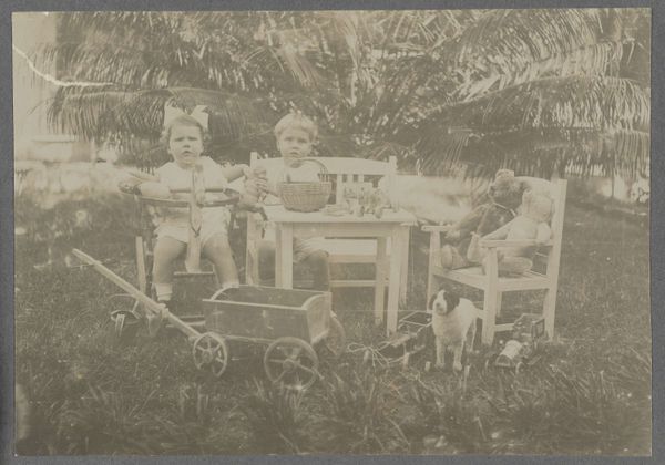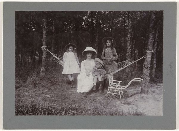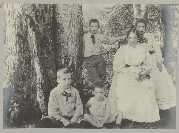 Editor: This gelatin silver print from 1913 is entitled "Groepsportret vande familie Kessler bij een omgevallen boom." It shows the Kessler family grouped together on and around a fallen tree. The light is soft, almost hazy, lending a dreamy feel. What can you tell us about this artwork? Curator: The fallen tree is an important, if somewhat melancholic, symbol. Trees often represent the family tree itself - lineage, strength, rootedness. Here, though, we see that symbol uprooted, on its side. What could that mean for the family depicted, especially considering it is a group *portrait* intended for posterity? Editor: Hmm, so it's not necessarily a positive image? I guess I assumed it was just a family having fun, but now I see a hint of something more serious. Curator: It prompts questions, doesn't it? Is the fallen tree a symbol of disruption or change? Is it a comment on mortality, a reminder that even the most robust structures are temporary? The composition itself reinforces this ambiguity – the family members are perched precariously, some looking directly at the camera, others gazing off into the distance. Editor: I see what you mean. The woman standing on the folding stool - she seems almost vulnerable. It changes the whole atmosphere. Do you think viewers at the time would have picked up on these symbols more readily? Curator: Absolutely. The Victorian and Edwardian eras were steeped in symbolism, from mourning jewelry to the language of flowers. A contemporary audience would have been keenly aware of the multiple layers of meaning embedded within a seemingly straightforward family portrait. Even today, though, we still unconsciously understand many of those symbols. Editor: That’s fascinating! I had completely missed the layers of meaning held in the image itself. Thanks, I’ll definitely look at photographs differently from now on! Curator: My pleasure! It's amazing how much history and cultural memory can be contained within a single image.