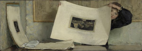 Curator: Looking at Cornelius Norbertus Gijsbrechts' oil painting from 1670, "Trompe l'Oeil. A Cabinet of Curiosities with an Ivory Tankard," one immediately appreciates the hyperrealistic illusion. What are your first impressions? Editor: There's a quietude about this piece. A slightly melancholic air. It’s intriguing how the mundane—papers, a quill—are elevated to this status through precise depiction. I wonder about the stories these fragments hint at. Curator: The 'trompe l'oeil,' or 'fool the eye,' aspect is central, achieved through meticulous application of oil paint, creating a deceptive sense of depth and texture. Gijsbrechts pushes the boundaries between the artwork and our perceived reality. The wooden panels framing the cabinet are also rendered in paint! Editor: Indeed. Consider the quill—a symbol of knowledge, power, perhaps even immortality through writing, contrasted with the fragility of paper. And that ivory tankard, likely a prized possession, alludes to status and taste, doesn't it? Each element functions as a symbolic artifact. Curator: From my perspective, this is a meditation on materials and craftsmanship, not only as demonstration, but the artifice is the meaning itself! Gijsbrechts presents the *act* of visual representation. I mean, notice the papers appear to cast actual shadows—a complete manipulation of depth through the density and layering of oil. Editor: Absolutely. This isn't just realism, but a heightened artifice to convey underlying messages about the fleeting nature of life, of earthly possessions, right? The objects represent both accomplishment and ephemerality. It's a fascinating display of symbolism rooted in the materials of everyday life. Curator: Examining Gijsbrechts' meticulous construction underscores this idea of value– a blurring of lines between common objects and high art through skillful application and presentation. It asks: What elevates an object to art? Editor: Precisely! And the artist achieves a multi-layered composition wherein a window showcases layers of implied symbolic meaning about society and our perception of reality. Curator: I find myself considering the contemporary appeal of simulated experiences, and how artists manipulate material representations of reality. Editor: And for me, the artwork reminds us of the continuous interplay between symbolic value and our evolving perception across cultures and time.