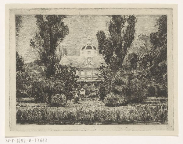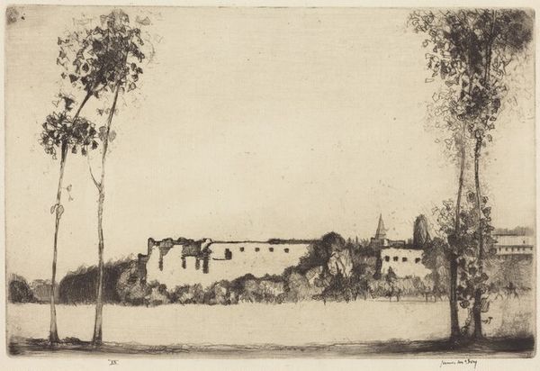 Curator: Gazing at this print, “Sogno Mio,” which translates to "My Dream," by Joseph Pennell, likely created around 1919 or 1920, what feelings stir within you? Editor: Initially, a sense of faded grandeur. It's sepia-toned, blurry, and somewhat melancholic. Is it me, or do these Italianate buildings always give off a wistful air? Curator: Perhaps it's the impressionistic technique, those suggestive, fleeting lines that evoke memory and longing. Pennell, as an artist, was always chasing that elusive emotion. He even spent some time rendering the architecture on different continents and then reflecting, it all went back to memory, to something never touched yet truly felt. Editor: I can see how the etching embodies memory and an imagined sense of history. With all that blurring, the etching, like the dream of a manicured garden party in front of an old country estate, might evoke a certain privileged class gazing in on their past as well, or the present through the mists of denial, or from an "us" perspective of outsiders dreaming what it would be like to be inside that house with that history and those privileges. Curator: That is interesting to bring forward. Etchings certainly have a historical charge being easily replicated. These are interesting considerations. Editor: Etching became, like photography and film, technologies for capturing the here-and-now, even as the subjects of representation changed. I wonder, how did the democratization of imagery influence the concept of home? "Home" is no longer just bricks and mortar; it's this projected image of ourselves and our heritage. Curator: Perhaps the essence of a 'dream,' captured through lines in acid and ink on metal, reflects that very human yearning to build and also belong—but in an era undergoing monumental transformations. It's beautiful that something made with architecture at the fore becomes even more poignant on introspection, it’s both built and built upon. Editor: Looking at it this way, I will say it all feels a bit like the “Gatsby effect”: always chasing a future informed by the past. It is this interplay of materials, eras and memories. What about you, any parting thoughts? Curator: Yes, thank you for joining me in today’s discussion of “Sogno Mio.” I will have to say I do consider the dream alive! It shows that the most potent art comes to us as something personally found, as though in an attic of curiosities we find its dream as our own, in some little way.