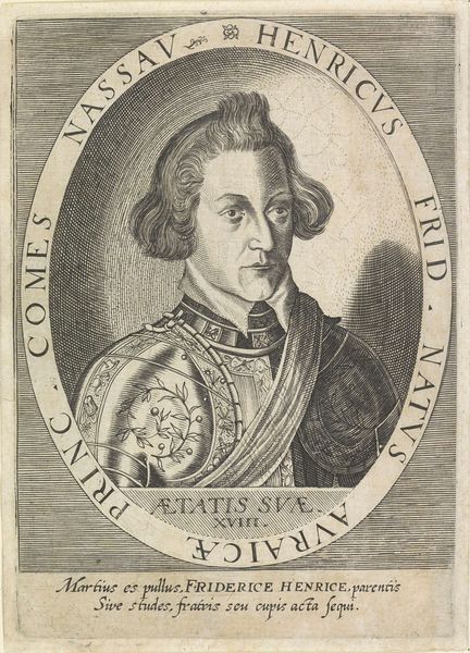 Curator: Before us is "Portret van Ernst Frederik van Baden," a compelling engraving crafted between 1600 and 1604 by Dominicus Custos. Currently residing at the Rijksmuseum, it offers a glimpse into the persona of a nobleman from a bygone era. Editor: Oh, there’s something terribly austere and distant about this rendering. The stark black lines create this almost rigid profile – a man encased in status. Curator: The artistry in printmaking truly amazes me. To capture the sheen of armor, the delicate ruffles, all through etched lines...it speaks to a meticulous, laborious process, doesn't it? We often overlook the sheer manual effort behind these seemingly simple images, the individual choices Custos made to render texture and form. Editor: Absolutely. Look at the way the hatching defines the metallic surface. The whole print, including that dense text, had to come off a press somehow – and the uniformity suggests real expertise at controlling all those material conditions to guarantee consistent quality over multiple pulls of an image. Curator: And it makes you consider Ernst Frederik himself. Was he truly as unsmiling as he appears? Or is this an idealized, almost stoic, representation intended to project power and stability during a turbulent period? The lines around his mouth hint at a more complex character, perhaps. Editor: Precisely! This image flattens all these intricacies, though. Think about the economics: the costs to acquire suitable metals for the plate, skilled labor to do the engraving. The end result becomes something bought and sold like any other commodity, regardless of representing some “high-born” noble, further distancing him from daily toil. Curator: Yes, but art also serves as an amazing mirror reflecting not only the person but also the socio-political landscape. It hints at family history, connections... Editor: Still, I tend to appreciate images most where some part of the material process breaks into view, interrupting that seamless illusion of depth. Like where we can observe imperfections on aged paper showing its tangible character! That reminds me we're looking at crafted objects that undergo natural degradation too. Curator: Indeed, a work where material speaks for itself is an open text waiting for dialogue with generations to come, like a whispered legacy from hands to souls… Editor: Perhaps artful making ultimately lies less in timeless perfection than imperfectly negotiating what you start with and knowing what to expect. It all comes out finally by just watching these slow processes work, you know?