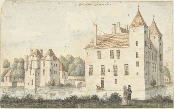 Curator: Gerrit Lamberts brings us 'Het slot Loevestein,' an etching on paper from somewhere between 1786 and 1850, preserved here at the Rijksmuseum. My first impression? Serene. Quietly imposing, like a stage set waiting for a drama to unfold. Editor: It strikes me as…stark. This isn't the romantic fairytale castle of popular imagination. The etching is detailed, precise, almost clinical. But that very lack of embellishment speaks volumes, doesn’t it? Loevestein Castle’s history as a prison weighs heavily here. Curator: Yes! The Neoclassical influence shines through, doesn't it? It has a coolness that suits the somber subject matter. And yet, the way the light falls, those hazy skies, a hint of poetry despite it all, wouldn’t you say? Editor: Definitely. And consider who would have been imprisoned here: religious dissidents, political opponents… This wasn’t just a building; it was a site of resistance against power. Lamberts gives us this rather unsentimental rendering, yes, but maybe he wants us to acknowledge the institution itself, the architectural manifestation of repression. The guard stationed outside in the left corner emphasizes this point of confinement. Curator: Oh, precisely! See the tiny figures; the way the artist contrasts their presence with the imposing scale of the architecture gives me a shiver. Do you imagine the tiny subjects of this landscape walking with anticipation to freedom, or the weight of entrapment? Editor: And what’s also important is who *isn’t* represented: the prisoners themselves. We see the exterior, the structure of confinement, but we have to actively imagine the bodies contained within. It is a ghostlier echo, because absence is also an extremely strong visual. Curator: You know, I get a peculiar feeling looking at this; an itch to visit. An imagined touch, too; rough stones under my hand. A castle is like a shell and also very telling of that interior, like our bodies and homes. This architectural representation is both immediate and elusive at once! Editor: Precisely, that tension between what’s shown and what’s intentionally left out—invites the viewer to confront uncomfortable truths about authority, imprisonment, and the individuals who challenged it. It encourages critical engagement, not just passive observation. Curator: It leaves me questioning everything! As all art should, truly. Editor: Indeed, Lamberts has crafted not just a depiction, but an invitation for discourse. A call to re-evaluate our understanding of the past, its shadows, and its echoes in our present.