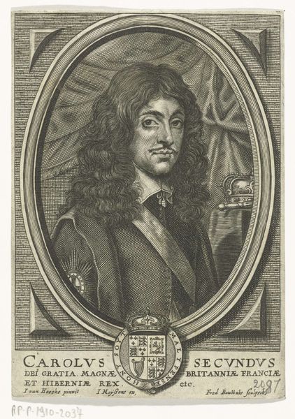Johann Christoph Boecklin created this print of John Selden sometime around the turn of the 18th century. It captures Selden, an English jurist and scholar, within an oval frame, highlighting his status through the Latin inscription. The image's meaning resides in its creation within a specific cultural and institutional context. Boecklin, a German artist, produced this portrait for distribution, likely within intellectual circles that spanned across Europe. Selden's scholarship, particularly his views on law and the relationship between church and state, were influential during a time of political and religious upheaval. This print then acts as a form of social currency, celebrating and disseminating Selden's ideas. To fully understand this work, one would need to delve into the history of 17th-century legal thought, the network of scholars who shared these prints, and the role of portraiture in shaping public perception. Art history reminds us that even a seemingly simple portrait is embedded in a web of social and intellectual exchange.