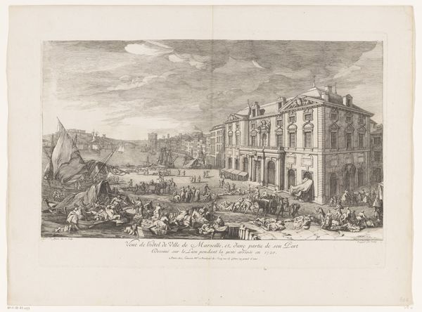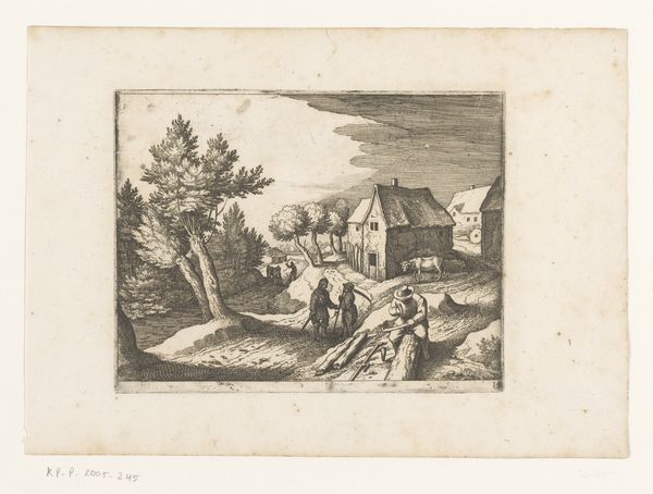 This is F.C. Scholten’s etching, "Et slot", made around 1742. The scene unfolds in a series of receding planes, using line and form to create depth. The architecture, with its ordered windows, stands in contrast to the organic shapes of the trees and billowing clouds. The composition is divided, the severe lines of the building on the left juxtaposed with the open, cultivated fields on the right, creating a dialogue between order and nature. Linear perspective draws the eye into the landscape, where figures are at work, adding a layer of narrative. The heavy sky, rendered with dense hatching, presses down, creating a sense of drama. Consider how Scholten employs line, not just to depict form, but to create texture and atmosphere. The etching is not merely a representation of a place, but an exploration of space and the relationship between human structure and the natural world. This exploration invites us to contemplate our own place within these contrasting elements.