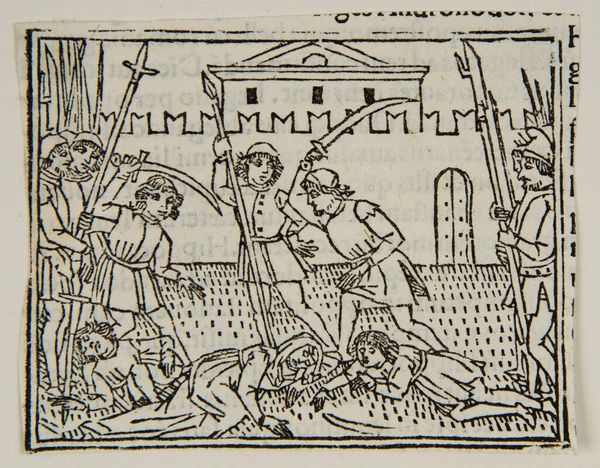 Curator: This woodcut print, titled "Book XXXIX.17. Bacchanalians Punished," depicts quite the scene of violence and judgment. Editor: It's raw. The thick lines and stark contrast create a sense of brutal immediacy. You feel the violence in the bodies and the unyielding gaze of the figures on the platform. Curator: Indeed. Note the composition—the elevated tribunal observes the bacchanalians below, with the swords forming dynamic diagonals that heighten the tension. It's a calculated use of line to direct the viewer’s eye. Editor: The material itself—the woodblock—imparts a crude, almost folk quality. There's little attempt to disguise the process of carving; it speaks directly to the labor and materials at hand. I wonder about its original context and distribution. Curator: Clearly this composition is meant to portray a firm moral order—the figures above exude authority. The lack of chiaroscuro flattens the space, further emphasizing this sense of unyielding judgment. Editor: Perhaps. But the image also reveals the harsh realities of power and punishment in this period. It speaks less of moral order, and more of labor and the subjugation of bodies. Curator: Perhaps our divergent readings reveal the image's enduring complexity. Editor: Precisely. The image, in its directness, speaks of the messy intersection of power, materials, and meaning.
