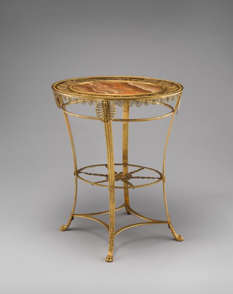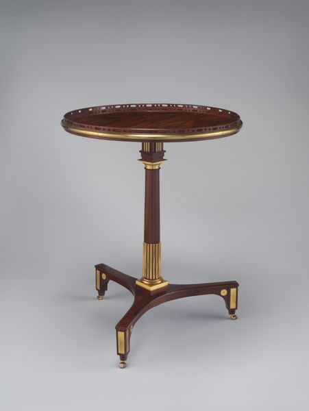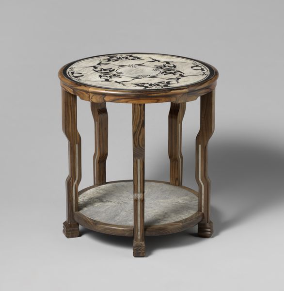 Editor: Here we have a wooden side table, entitled "Tafel, rond, ontwerp Jan de Meijer" which translates to "Table, Round, design Jan de Meijer", crafted sometime between 1925 and 1929. It really emphasizes geometry and circularity... What compositional elements jump out at you? Curator: Primarily, I’m struck by the interplay between the smooth, polished surfaces and the patterned wood grain. Notice how the vertical supports, despite their rigid linearity, are visually integrated by their curvature and the consistent use of material, with attention given to joinery. What function do you think that ornamentation on the pillars serves? Editor: Well, perhaps it provides a contrasting texture and decorative accent. It is an eye-catching element and breaks the monotony of the plain, wooden pillars, adding a bit of visual interest. Curator: Indeed. It underscores the table's Art Deco sensibilities. Consider the formal relationships between the circles; the top and lower shelf echo each other, creating a balanced, hierarchical composition. This kind of careful organization reflects a particular interest in order and rationality. How do the materials and techniques contribute to the overall aesthetic effect? Editor: The warm wood tones, especially with that kind of glossy finish, combined with simple construction makes for a functional object, and simultaneously radiates warmth. Curator: Precisely. The high gloss finish does not just highlight the inherent beauty of the wood but adds a layer of sophistication which defines luxury. The artist shows a real understanding of the material and emphasizes an appreciation of its structure to produce a visually arresting design. Editor: I didn't consider how the finish influences the look of the structure and texture. That's an insightful viewpoint. Thank you. Curator: And thank you; examining such works together enriches our understanding of form and function.