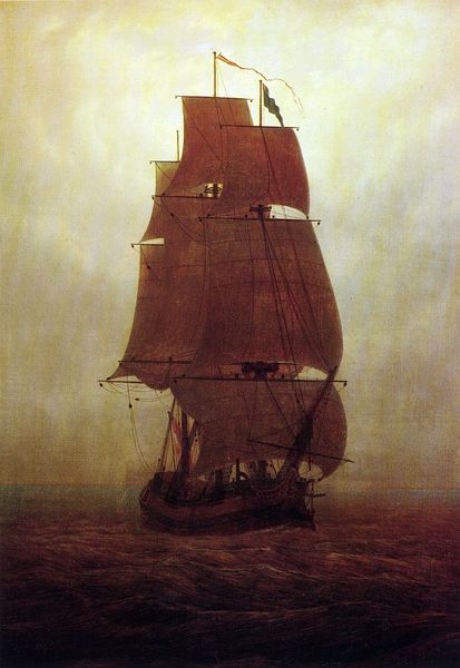 Curator: Oh, it’s all misty longing, isn't it? Like a faded memory, viewed through a heat haze... is this Aivazovsky's 'Ship'? Editor: Yes, indeed. This marine painting by Ivan Konstantinovich Aivazovsky uses oil paint to depict a majestic sailing ship, and you are right it’s hard not to notice its distinctive ethereal moodiness. The date is unknown, though the artist was most prolific across the 19th century. Curator: Prolific is an understatement! You feel him capturing a shared yearning, right? This quiet dream of the open water. What gets me is the color. Everything melts into this dreamy, pale light… It’s more emotion than ocean. Editor: Aivazovsky definitely excelled in manipulating light and atmosphere, a reflection of the Romanticism period, don’t you think? The almost minimalist rendering here allows a specific focus. The sails are emphasized; as such the visual balance positions the vessel as an envoy of progress. Curator: Ah, "progress." It sounds so definitive, doesn’t it? It’s such a small detail, but I think the red flag makes it personal somehow... not a collective enterprise, but someone's vision. Maybe mine! Aivazovsky had to be feeling that connection. Editor: It would be quite aligned, given the context of artistic patronage in Imperial Russia. The maritime achievements of the state were very deliberately woven into public art. Curator: Well, history or heart—whatever sails your boat, the skill is plain. Even if you take away any political gloss, he captures this transient shimmer between light and water beautifully, the peace before you crest the wave of your next big change. Editor: Absolutely. What Aivazovsky accomplishes is no small feat. A detailed maritime study that exists independent of a particular timeframe due to its immersive depiction of light and scale. I can appreciate that, as you put it, emotional ocean. Curator: Couldn’t have said it better myself! Editor: Likewise. Thank you for your time and thoughts.