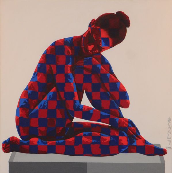 Curator: The work we’re looking at is an untitled painting by Sonaly Gandhi. It presents a seated figure in a contemplative pose. What strikes you first? Editor: Immediately, it's the application of that bold checkerboard pattern onto the figure. It's jarring yet captivating. It gives me a sense of unease, like something is off. What material was used in creating this interesting work? Curator: It appears to be primarily acrylic paint on canvas. The artist’s usage really places this within a context of modern issues of identity and commodification of the female form. The checkered pattern could represent social constraints imposed on women, segmenting them into prescribed roles or expectations. Editor: That reading is really insightful, especially considering your attention to themes. To me, the process hints at a mechanical reproduction, like stencil art, almost stripping away the subject's individual identity. But that grid is hand painted, it’s irregular, so, some hand work there. How the artist manipulates that medium, the labour invested, makes me reconsider any rapid readings about superficiality. Curator: Indeed, this can connect to debates in feminist theory about how women are perceived – their bodies become objects of consumption. How is agency asserted within these confining structures? I think that tension is palpable. The figure isn’t erased, yet is visibly patterned. Editor: The pattern almost becomes a material itself, a kind of woven textile covering. Is she being commodified, or does this intricate crafting reclaim some ground for female artistry within the means of making? Also I want to note the gray gradient on which the woman stands as if it highlights some industrial manufacturing. What is the context of that gradient? Curator: Perhaps the grayscale evokes a foundation, like an industry the artist places this female identity upon. What do we build when we attempt to apply identities to human beings and attempt to make assumptions about an individual’s personality from their gender. Editor: Interesting interpretation of modern societal constructions that weigh heavy in any such analysis. Curator: Well, on this piece, there are so many valid approaches. It shows just how the context of any work shifts constantly.