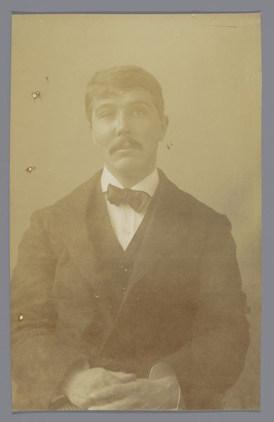 This is a mounted albumen print of an unknown man, made by Albert Greiner in the late nineteenth century. Photography as an institution was still relatively young, and portraiture was becoming increasingly accessible to the middle classes. Consider the sitter's carefully cultivated moustache, goatee, and bow tie. These are visual markers of bourgeois masculinity in Europe at this time. The man’s formal attire and poised expression speak to a desire for social presentation and upward mobility. This image serves as a window into the aspirations and self-conceptions of a particular social class during a period of rapid change. Historical sources such as journals, newspapers, and studio records, can reveal more about the networks of portrait photographers like Greiner, and the clientele they served. By situating this photograph within its social and institutional context, we can better understand its role in shaping identities and social hierarchies.