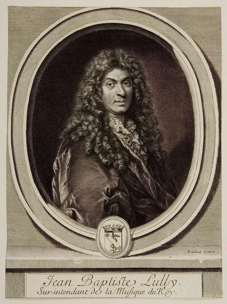 Curator: The Rijksmuseum proudly presents "Portrait of Philippe Quinault," an engraving conceived between 1666 and 1707, masterfully etched by Gérard Edelinck. It's a striking example of Baroque portraiture. Editor: My initial response is one of formality and power; this is very much an image carefully curated for a specific kind of consumption, but in a way it seems to carry more than the sitter. Curator: Edelinck's engraving beautifully encapsulates Quinault’s position as a dramatist, auditor and member of the Académie Française during the reign of Louis XIV. To contextualize, Philippe Quinault wrote the librettos for several of Jean-Baptiste Lully’s operas, a partnership crucial in establishing French opera as its own distinctive art form. How might that relationship to power through music, have played out in society? Editor: Absolutely. The composition itself—the ornate frame, the flowing wig, the robe and coat of the sitter—speaks volumes about status and privilege. Beyond that though, I see an intentional cultivation of persona. In other words, if we recognize the baroque, can we recognize the performativity of it too? Curator: I agree. The swirling lines of the Baroque style do offer a sense of the dramatic, so how does it engage in our modern ideas of celebrity, particularly when juxtaposed with his other role of "Auditeur des Comptes"? Editor: Exactly! He is portrayed in the center as powerful, yet approachable and maybe there's more that is performative to this engraving. This goes beyond mere likeness and intersects with the politics of identity and the control of representation. His expression and relaxed posture contribute to a narrative of erudition and a relaxed confidence, further underlining his position as someone to be admired and respected. I think it reveals the era’s desire to present powerful figures with humanity. The very deliberate composition serves specific goals in establishing an image of power for its patron or intended consumer, more than just Quinault himself. Curator: This piece speaks not just about individual identity, but about the construction of societal roles and influence in 17th century France, and how that performance echoes into contemporary views. Editor: Indeed. Examining art through the lens of social and cultural history reveals how imagery is wielded to uphold systems of power, prompting us to reflect on its enduring impact.