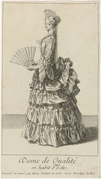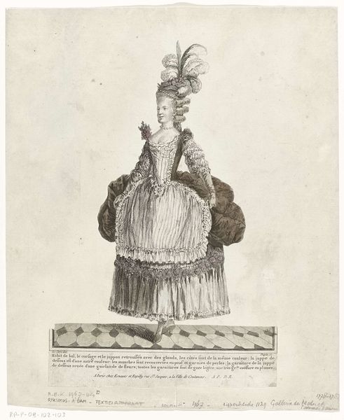 Nicolas Dupin created "La sémillante Lisett" in 1786 as part of the "Gallerie des Modes et Costumes Français," using etching to illustrate French fashion. The etching, with its delicate lines and intricate detail, captures the opulence of late 18th-century attire. The composition focuses on the subject's elaborate dress, emphasizing its volume and ornamentation. The artist skillfully uses hatching and cross-hatching to define the textures of the fabric and the intricate ruffles, highlighting the material richness. The semiotic codes embedded in the clothing reflect the values of the aristocracy, where fashion was a language of status. This challenges fixed meanings by presenting fashion not merely as adornment, but as a performative aspect of social identity. Each element contributes to a complex system of representation. This image provides insight into the cultural and philosophical discourses surrounding fashion and identity in pre-revolutionary France.