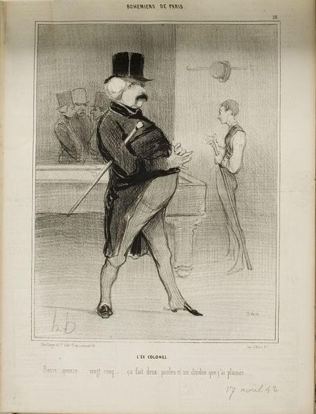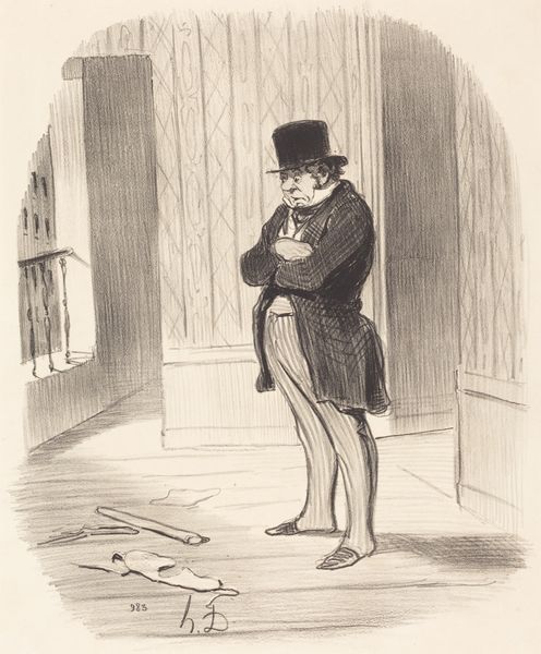 Curator: Look at this lithograph, "The Businessman" by Honoré Daumier. The Harvard Art Museums hold this glimpse into 19th-century Paris. It immediately strikes me as frantic, almost Chaplin-esque in its energy. Editor: Absolutely, and the frantic energy is key. Notice the inscription "Justice de Paix" on the door he's rushing towards. Daumier’s using satire to critique the social structures of the time. Who truly has access to justice? Curator: It’s a pointed question, isn't it? The man, ostensibly respectable in his top hat, is rendered almost absurd by his haste, his spindly limbs. There's a palpable tension between appearance and reality. Editor: Exactly, and consider the caption! The businessman is dealing with a petty case—a grocer and hidden money. The image critiques class and access to legal recourse, reflecting broader power dynamics. Curator: Daumier’s talent was in capturing those little moments that expose bigger truths. It makes you wonder what was lost in translation. Editor: For sure, Daumier's brilliance lies in holding up a mirror to society’s hypocrisies. I think it speaks volumes about how we still grapple with similar issues today.