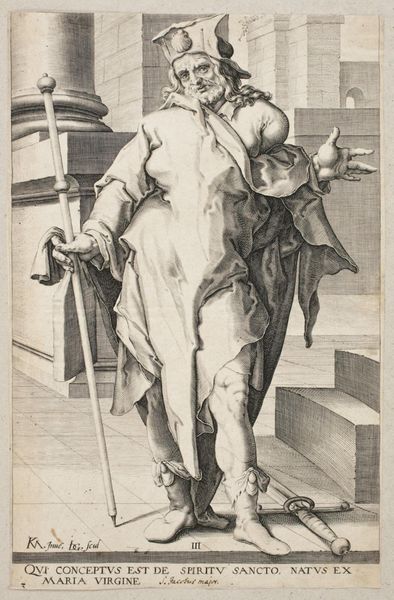 Salomon Savery created this etching of a standing officer with a walking stick in the Netherlands in the 17th century. Images like this offer a fascinating window onto the social hierarchies of the time. The officer, with his elaborate costume, lace collar, feathered hat, and swagger stick, embodies the visual codes of status and authority. His clothing speaks to the economic structures that supported the production of luxury goods and the social norms that dictated who could wear them. In the background, Savery has added a classical archway, a conventional indication of the sitter's refinement. What’s remarkable about prints like this is that it makes this image of power mobile. It was part of a series of military figures and this circulation speaks to the image of the military in the Netherlands at this time. By consulting costume books, military records, and other period documents, we can continue to unpack the complex social meanings embedded in this seemingly simple portrait.