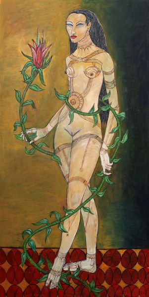 Joe Machine made this 'Portrait of a Prostitute' with paint, and with feeling. There is something urgent in the handling of the paint. See how the black background seems almost like a void out of which the figure has risen. Look at how the light falls on the skin, it is built up of thin layers, and the marks are almost scrubbed into the surface. I keep thinking about the way the paint creates a tangible sense of presence, the stockings especially, how the texture of the paint creates the illusion of fabric. It's as if he's trying to trap the figure in the painting, like a memory you just can't shake. I'm reminded of Lucian Freud's unflinching portraits, but with a punk rock edge. Ultimately, Machine's painting is a reminder that art doesn't need to be pretty to be powerful, it just needs to be honest.