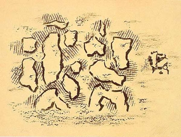 Curator: This monochrome print, titled "Souvenir a Bretagne" by Emile Bernard, offers a fascinating look at rural life and memory. The figures and landscapes rendered with bold, almost harsh woodcut lines really stand out. What's your first impression? Editor: Austere, I'd say. And…purposeful? The sharp contrasts certainly draw my eye, but it feels very simplified. Like he’s stripping everything down to bare essentials in both the subject and the method of representing it. Curator: Absolutely, this reductive style reflects Bernard’s involvement with the Symbolist movement. Look at how he uses those heavy lines not just to describe the forms but to convey the weight of the figures. Do you see the woman carrying what looks like a heavy load? It’s more than just luggage. Editor: It really strikes me how Bernard chose the woodcut medium. It gives a sense of what life must have been for those Breton peasants he depicted, with all its rugged simplicity and hard work. And, thinking about this being a “souvenir," there's that romanticized view of rural life often promoted in cities at that time. Curator: Good point. The Symbolists often sought truth in simplicity, so it fits in with that romanticization of peasantry. Also, this flattening of form—it’s not just about showing Breton life as it *is,* but representing an *idea* of Breton life. You notice the composition uses blocks or vignettes almost; a segmented memory. Editor: I see that. This work feels deeply rooted in a specific moment in art history when artists sought meaning beyond mere representation, responding to rapid industrial change in their search. What symbols, besides just “Breton peasants", can we decode? Curator: That's it—a kind of anti-industrial, spiritual counterpoint. I would look to that woman holding a sheep or lamb—an archetypal symbol of sacrifice and simplicity; and the ever-present ducks of a very stable local food chain. These carry deeper allegorical meaning that echoes through centuries of agrarian life in the west. Editor: So, looking at it through those lenses, "Souvenir a Bretagne" becomes more than just a memory. It becomes a statement about tradition, resilience, even spirituality, that resonates even today. Curator: Precisely. A snapshot and a symbol, rendered in the artist's unmistakable and raw vision, which begs reflection about a bygone era through both symbol and artifact.
