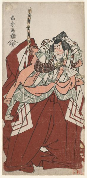 Curator: This colorful woodblock print by Katsukawa Shunchō, titled "The Boys' Festival," depicts a domestic scene related to this annual event. Editor: It's charming. The composition almost feels like a stage set, with the figures arranged within the defined space. The muted color palette is quite appealing. Curator: Indeed. The print showcases the materiality of ukiyo-e, with its distinct lines and flat planes of color achieved through meticulous carving and printing processes. The social context is equally important; the Boys' Festival was a crucial event for families to celebrate and ensure the health and prosperity of their sons. Editor: I'm curious about how the placement of figures and objects plays into the social messaging. Is the positioning of the mother holding the child, juxtaposed with the armor, meant to emphasize specific roles or expectations within that society? Curator: Precisely. The armor symbolizes strength and protection, while the mother and child represent the continuation of the family line. These images, circulated widely, helped reinforce societal values. Editor: Thinking about its circulation, it's fascinating how these prints functioned as both art object and social tool. Seeing the evidence of production techniques really drives that home. Curator: Agreed. The intersection of artistic skill, material production, and the promotion of cultural ideals makes this a particularly compelling image to consider. Editor: It leaves one pondering the complex ways in which art shapes, and is shaped by, the society around it.
