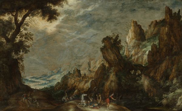 Editor: Salvator Rosa’s oil painting, "Saint John the Baptist Baptizing Christ in the Jordan," dated 1655… it’s striking. The figures are almost swallowed by the overwhelming landscape. I’m curious, what draws your eye when you look at this piece? Curator: It’s fascinating how Rosa uses this grand landscape to frame a key religious moment. But more than just illustration, I see an assertion of power, specifically the power of the Church during a time of political and social upheaval in Europe. The Baroque style itself, with its dramatic lighting and theatrical compositions, became a tool to inspire awe and reinforce authority. Notice how the figures are placed low in the composition; it visually elevates nature as an expression of divine will. How does that contrast with other baptisms you've seen depicted? Editor: That makes sense. The theatrical Baroque style I have usually seen displayed in a more domestic or controlled setting; here nature feels more powerful. And indeed, earlier paintings I’ve seen of this scene focus primarily on the figures and their gestures. Curator: Exactly. And think about the patronage: Who commissioned a painting like this, and where would it be displayed? Most likely, an elite member of the church. These choices were made, not only as an aesthetic decision, but also for maximum public impact to control visual narratives and communicate authority. The setting wasn't simply backdrop. It validated the moment and strengthened its impact on its intended audience. Editor: So, the vast landscape is not just scenic, but political. By emphasizing nature's grandeur alongside this religious event, it connects divine power with the earthly power of the church. Curator: Precisely. It urges us to consider the painting as more than a religious scene, but also as a carefully constructed assertion of institutional authority. Editor: That really shifts how I see it. It’s no longer just a bible scene but almost propaganda. Thank you! Curator: A good reminder that even the most beautiful works are entangled with the power structures of their time.