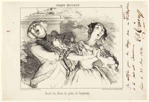 Editor: This is Honoré Daumier’s lithograph, *Expérience qui réussit trop bien*, made in 1853. The scene is so chaotic! It looks like a séance gone wild, with figures flailing around a levitating table. What do you see in this piece, from a symbolic perspective? Curator: Daumier here taps into the 19th-century obsession with spiritualism. Table-turning, or “fluidomanie” as the title suggests, became a popular craze. Notice how he exaggerates the figures' features, rendering them almost grotesque? This amplifies the critique of irrational beliefs seizing society. Consider how the floating table—the supposed centerpiece of spiritual connection—becomes a symbol of absurdity itself. What cultural anxieties might this exaggerated portrayal be reflecting? Editor: I guess the anxieties of modern life, the unknown forces at play. The lithograph highlights the ridiculousness of seeking meaning in supernatural phenomena when perhaps meaning could be found elsewhere? Curator: Precisely. Daumier also links spiritualism with Romanticism’s turn to the irrational and emotional. The romantic movement in literature, painting and even architecture celebrated strong feelings. Can you see the tension there, how Romanticism prized strong feelings, while this lithograph ridicules excessive, misguided enthusiasms? Editor: Absolutely! The emotional extremes of the figures are comical. I see how Daumier uses caricature to critique not just spiritualism, but a broader cultural mood, the risk of surrendering reason to… whatever this is! Curator: Yes, the wild emotionality is captured by posture, angle, expression - the formal elements intensify meaning! Symbols become charged when faith abandons rationality, don’t they? This image captures an enduring aspect of human nature, our attraction to the mysterious and unknown. Editor: This has me questioning what it is that societies use as anchors during great cultural or technological change. It appears here that perhaps Daumier suggests spiritualism is more of a crutch than an answer. Curator: And maybe Daumier wanted us to wonder whether there were other "fluidomanies" present at that time.