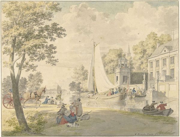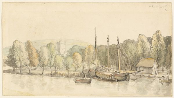 Editor: So this drawing, “River Landscape with a Large Blunt Church Tower,” by Hendrik Spilman, made sometime between 1733 and 1784, feels like a slice of everyday life in the Dutch Golden Age. It’s monochrome, delicate ink on paper. What stands out to you about it? Curator: Notice the evidence of labor everywhere. Look closely at the varying techniques used to represent different materials: the scratchy, layered strokes suggesting the rough thatch of the humble dwellings versus the smoother washes delineating the imposing stone tower. It’s not just about picturesque scenery; it's about how different classes engaged with and shaped the landscape using specific tools and processes. Editor: That's interesting. The contrast is so subtle; I hadn’t really focused on that level of detail. What does that suggest to you about the relationship between those social classes? Curator: I see a co-existence defined by the materials themselves. The tower, built of enduring stone—quarried, transported, painstakingly constructed—dwarfs the ephemeral structures built from reeds and wood, things sourced directly from the land. Consider the sheer manpower required to raise that tower and then think of how temporary the riverside houses seem. The materials speak of a hierarchical social structure inherent in its means of production. Editor: It’s making me think about the environmental impact of those different ways of building, too, how they affect trade routes and resources. Curator: Precisely. Spilman encourages us to contemplate not just what we see, but the methods, the hands, and the social context involved in bringing the depicted world into existence on paper, all the while making that distinction through the use of his ink on that paper. Editor: I see that now. It's so much more than just a pretty landscape drawing. Curator: Exactly. It reveals itself as a study of societal relations reflected in material culture.