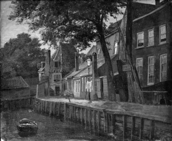 Curator: Here we have Johan Ulrik Bredsdorff's "Gadekæret i Kajerød," painted between 1891 and 1893. It’s currently held here at the SMK, Statens Museum for Kunst. Editor: It's like stepping back in time! So still, so muted... like a faded photograph found tucked away in someone’s attic. There’s a profound sense of calm, almost melancholy. Curator: Bredsdorff worked in a period when Realism was being challenged by Impressionism. The social climate in Denmark at the time saw an increasing focus on rural life and local identity. "Gadekæret i Kajerød" embodies that yearning for an untouched past, even as industrialization began to creep in. Editor: The reflection of the buildings on the pond – that gets me. There's something almost eerie in those perfect, upside-down doubles, as if the world has another identical self hidden just beneath the surface. A secret Kajerød lurking just out of sight. Curator: Exactly. Bredsdorff is capturing the essence of a very particular Danish identity connected to its rural landscapes. Note also how this monochrome landscape allows us to consider the tonal relationships as carriers of meaning. It certainly emphasizes the solitude. Editor: Right, it almost makes the entire scene feel suspended— those cows and the figure feel so far away. The grayness lends a kind of neutrality, doesn't it? Like Bredsdorff is observing without judgement. Just a quiet observer in Kajerød. I feel that calm deep inside, as a viewer. Curator: It reflects how he found beauty in everyday scenes, ennobling rural life at a crucial moment of social change. And, if you compare this painting to other contemporary landscapes, you'll find that the monochrome treatment serves as an elegiac tone. Editor: True, it's almost as if he knew this simple, rural idyll couldn't last forever. Looking at it, I'm reminded that sometimes, it's the quiet moments that echo loudest through history. Curator: Indeed. And considering its understated quality, Bredsdorff's vision resonates to this day. Editor: Absolutely, a simple pond made into a time capsule.