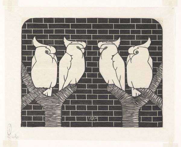 Editor: So this striking woodcut, possibly from between 1914 and 1918, is titled "Ringuil" by Samuel Jessurun de Mesquita, found in the Rijksmuseum collection. I’m immediately drawn to how this very stylized owl seems both imposing and vulnerable within its brick frame. What historical lens can you shed on this piece? Curator: Indeed, this is a fascinating piece to consider from a historical point of view. The work’s creation likely took place during or shortly after World War I, and it's difficult to separate any artwork from its socio-political climate. What effect do you think the owl having such geometric features, while still set in such natural media, had on audiences viewing this image? Editor: That’s interesting. It does feel… slightly unsettling. Maybe like nature constrained by man? What purpose does this tension create? Curator: That tension, as you describe, is precisely the point. Remember, symbolism thrived during this period. The owl is often associated with wisdom, but also with darkness, vigilance and even death. Contextualize this image with the horrors unfolding in Europe at that moment. The owl may very well function as a commentary on a world losing its wisdom. Consider further the impact this might have had on audiences of the time as woodcut prints are incredibly common and able to disseminate into various socio-political settings. Editor: I see. The choice of the owl and the rigid framing becomes much more significant. It's no longer just a stylized animal, but a reflection on the turbulent times. I will remember that. Curator: Absolutely. Analyzing the relationship between artwork and the historical, cultural environment offers a deeper appreciation of its meaning and resonance. It really shows just how political art can truly be.