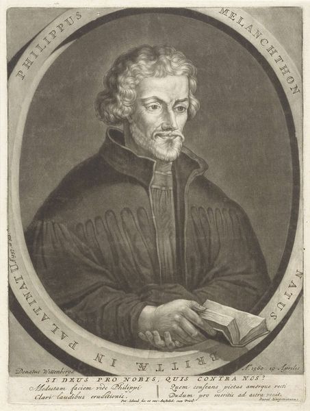 Curator: Immediately, the grayness of this engraving just swallows you whole, doesn't it? Editor: It does possess a certain… gravity. We’re looking at Wenceslaus Hollar's 1659 engraving, “Portret van Franciscus Junius de Jongere," part of the Rijksmuseum's collection. What strikes me first is the masterful rendering of texture, from the furrows on his brow to the crisp pages of the book he holds. Curator: Oh, those lines. They kind of crawl around the page. I imagine Hollar really had to embrace that intensity while crafting it, that stoicism practically radiating from his eyes. The shadows have shadows! Editor: Indeed. Hollar utilizes the technique known as "open bite" allowing for a deeply saturated tonality. Notice how this portrait achieves depth through contrasting light and dark. Consider too the subject himself, presented against that delicate backdrop. It certainly evokes Baroque sensibilities of portraying depth and grandeur. Curator: He holds the book, like, protectively... like it contains secrets! I wonder if de Jongere himself felt that weighted by the same pressures back then? Editor: Quite possibly. As an engraver Hollar lived through a period marked by shifts in knowledge dissemination – from manuscripts to prints. Junius would certainly represent for him an exemplar in scholarship and theological debates and perhaps a reminder of how potent books could be at instigating and nurturing critical thought. Note also the clouds barely outlined on the horizon and the fact that Junius is in his elder years, possibly symbolizing his imminent transition from Earth. Curator: That’s really striking because those are just gentle suggestions of clouds. And just barely outlined gives that scene the lightest breath... Hollar managed to bring that scene to life. Editor: Absolutely. There's an undeniable intimacy. What resonates for me is how an object produced mechanically as a printed edition transcends itself, revealing both technical sophistication and capturing emotional states about one singular person who holds stories beyond one single page. Curator: Makes you wonder what story that little book could actually hold. It’s enough to pique curiosity. Editor: And that, perhaps, is Hollar's triumph, encapsulating so much with such elegant restraint.