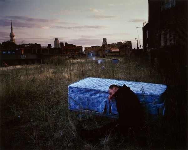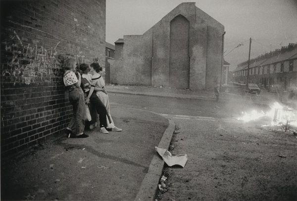 Editor: This black and white photograph, "Heroin Smokers in the Gumruch Neighborhood, Teheran" by Gilles Peress, was taken sometime between 1979 and 1980. There's a bleakness to it, figures huddled on the side of a street. What stands out to you about this piece? Curator: This image, taken during a turbulent period in Iranian history, operates as a powerful piece of social commentary. The composition directs our gaze down this stark street, implicitly critiquing the socio-political circumstances that lead to such visible desperation and drug use in a public space. How do you think the choice to shoot in black and white affects our interpretation? Editor: It definitely adds to the feeling of despair, I think. Color might make it feel… too real, maybe? Or sensationalize it in a way that black and white avoids. Curator: Exactly. Peress isn’t just documenting; he's prompting reflection on societal problems. The lack of color allows us to focus on form and texture—the rough brick, the slumped postures, the expressions of alienation. It brings up questions about the photographer’s intentions, his own social position, and how this kind of image could be received differently across different audiences, or then and now. What do you notice about where he positions himself relative to his subjects? Editor: It's interesting; he's not exactly hiding, but he's not intruding either, more like an observer. Curator: Precisely. It becomes crucial to consider the ethical dimensions of this approach. Who is this photograph *for*? What narratives does it support or challenge, both within Iran at the time, and internationally? The Gumruch neighborhood in Tehran may mean something different for someone from that city versus someone with no idea about Iran. Editor: I see what you mean. It really is more complex than just a snapshot of drug use. Curator: Photography, especially documentary photography, carries this weight of social responsibility, of shaping perception and, hopefully, driving dialogue about the worlds that we build. This photograph really captures that struggle. Editor: I will definitely keep these aspects in mind moving forward; it provides great new context to the image!