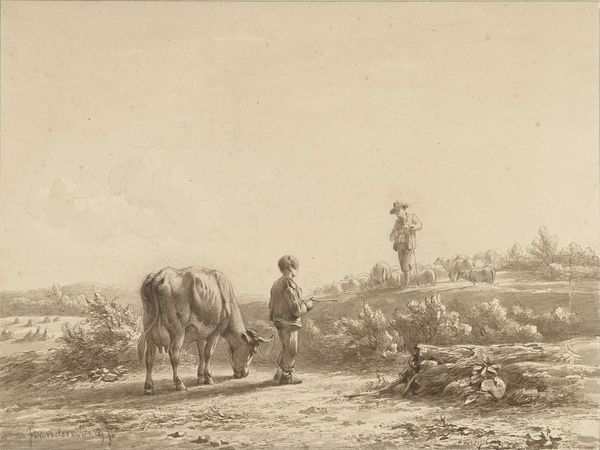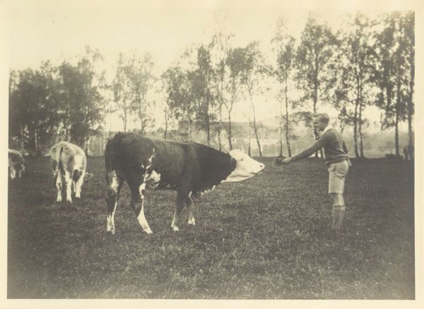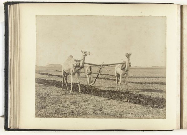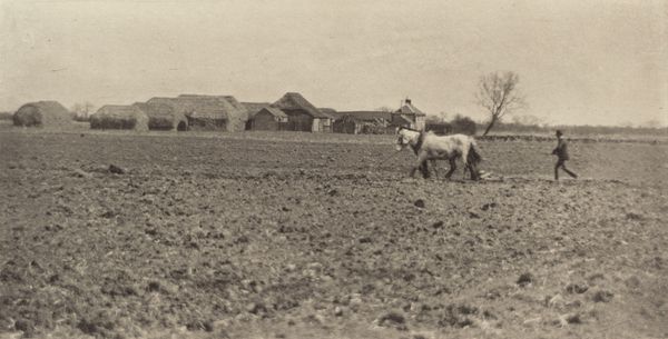 Curator: Richard Tepe captured this rural scene sometime between 1900 and 1930. It's a gelatin silver print called "Twee ossen voor een ploeg"—Two Oxen Before a Plough—currently held in the Rijksmuseum. Editor: There’s a quiet stillness to this piece, even with the depiction of labor. The composition is quite stark: two oxen and a farmer dominate the foreground against a muted, hazy background. The textures of the soil and animal hides are also wonderfully emphasized. Curator: I think what’s really compelling here is how it encapsulates a period of intense societal shift in the Netherlands. While we see these traditional farming practices, photography itself was becoming a powerful tool for documenting—and even shaping—ideas about national identity and rural life. Editor: Absolutely. From a purely formal perspective, look at the tonal range Tepe achieves with a monochrome palette. The way light interacts with the bodies of the oxen, particularly highlighting their musculature, creates a powerful contrast. And it’s enhanced by a classical balance. Curator: And who was this intended for? The rise of photography coincided with increasing urbanization and a growing middle class. Images like this would likely evoke a sense of nostalgia or perhaps a romanticized vision of simpler, agrarian times among urban dwellers. Editor: You make an astute point. If we look closer at the structure within the scene, we will note the composition directs your eye. There’s the diagonal line that leads the gaze from the oxen toward the farmer in the field. This guides our viewing of the whole scene. Curator: Exactly. It highlights not only agricultural work, but it may also highlight a growing disconnect from that type of life. In some ways, the work asks, what does progress actually mean? Tepe documents an intimate moment that, through industrialization, disappears from a large number of people's memories. Editor: So, we’ve got this visual echo of tradition, masterfully constructed through light and shadow. I appreciate its aesthetic strength combined with its societal implications. Curator: Indeed, the work serves as a reminder of a way of life undergoing profound transformation, making it far more resonant than a simple photograph of farm animals.
